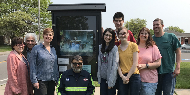 The north side of the kiosk in front of the Evans-McGraw Learning Center is dedicated to rotating a display of art work from Irondequoit High School art students. The art work displayed is done by the “Heidi Hoenig Scholarship” winner. The installation of the art work is done each June after the Scholarship winner is named by the West Irondequoit School District. HIPP worked with the Town of Irondequoit and the West Irondequoit School District to fund and install this community kiosk.